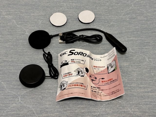 ヘッドセット本体、取付用ベルクロ、USB-Cケーブル、取扱説明書が入っている。Bluetooth機器はBT GOと同様に2台登録可能で、ナビ用のiPhone12miniで音楽を聴いている途中に、通話用iPhone16に着信があるとこれに応答可能なようだ。