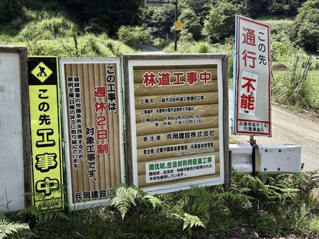 峠の少し手前にある林道樅木沼谷線の入口には工事中の看板があった。10月末まで災害復旧工事とのこと。昨年来たときは反対側から入ったが、舗装区間で何か所か崩落があったのでそこを直すのかな。