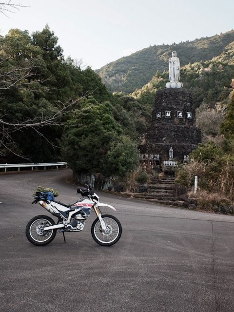 県道43は道の駅を過ぎると急に狭くなり、落石や落葉の堆積、苔が増えてくる。ツーリングサポーターは高畑橋のところから別ルートを示していたが、そのまま県道43を進んでみた。狭路はずっと続き、県道45に合流後もしばらく狭かったが、県道45と分岐後は道路もよくなってきた。県道46で妙法山の周りを進んでいくと割と大きな菩薩像があった。