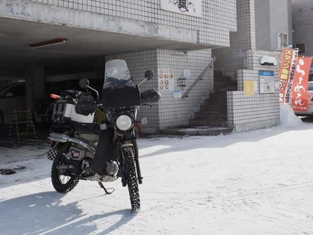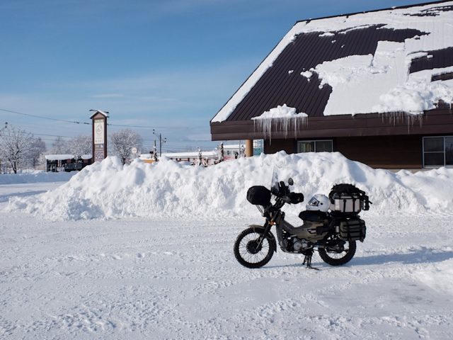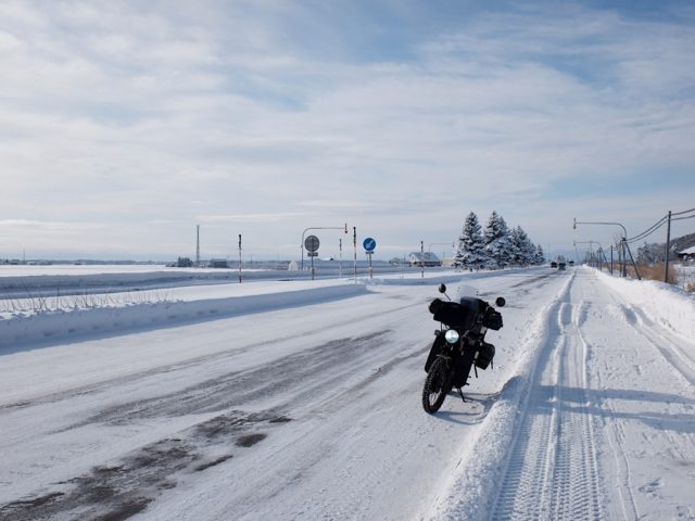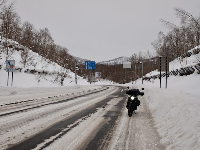 国道12を進むが深川でミスコース、すぐに戻って旭川市街を抜け、士別との境の塩苅峠へ。峠の名称は、旧国名石狩と天塩のからとのこと。午後は曇ってきたが雪は降らず、風も穏やかだったのでコンディションは悪くなかった。路面の黒い部分はアイスバーンで、スパイクが効くので走りやすい。