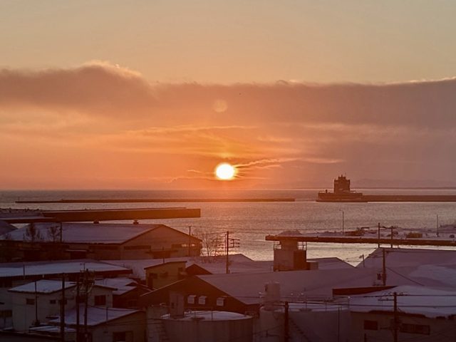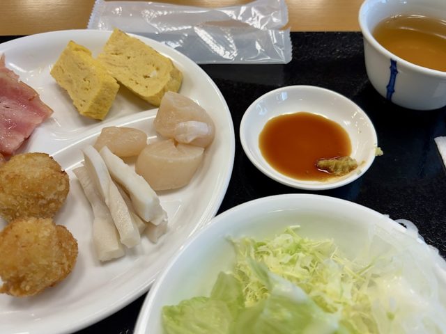 普段は”素泊まり”を選択するのだが、直前に日程を変更した関係で紋別では’朝食あり”になっていた。今回のツーリングでは一番ちゃんとしたホテルで、朝食バイキングにホタテの刺身があった。刺身ばかりたくさん食べている人もいた。