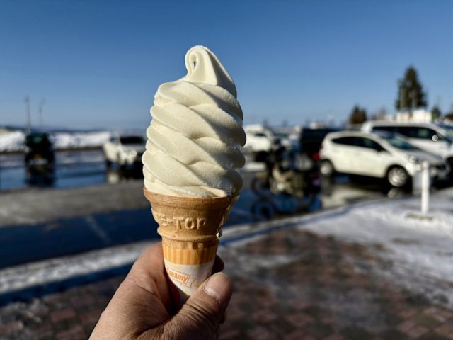 気温が上がってきて厳冬の服装では少し暑い。ソフトクリームで冷却。