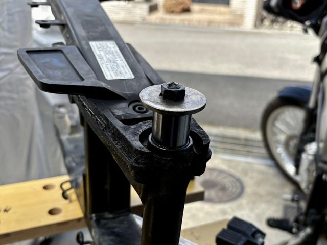 淡路島ツーリングでリアサスを沈み込ませると、「キコキコ」とまではいかないが「キッ」という音がしているのに気が付いた。そのうちやるつもりで部品を手配済みだったので、セローの時と同様にスイングアームのピボットブッシュをベアリング化した。まずはスイングアームを取り外し。