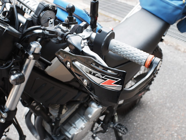 以前にZETAのアントラーハンドガードを購入して取付けたところ、寒いと割れるというリコールで回収になってしまった。その後、より柔軟性のある材質で再販されたときに購入していたのだが、結局取り付けずに放置していた。トリッカーで林道に行くときに思い出したので取り付けてみた。トリッカーはトップブリッジのボルトが1本(セローやWRは2本)でアーマーハンドガードのトップブリッジマウントが使えないので、ちょうどよい製品かも。