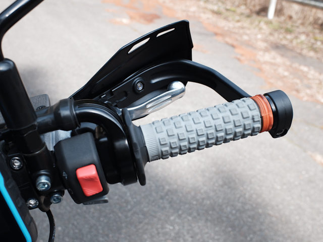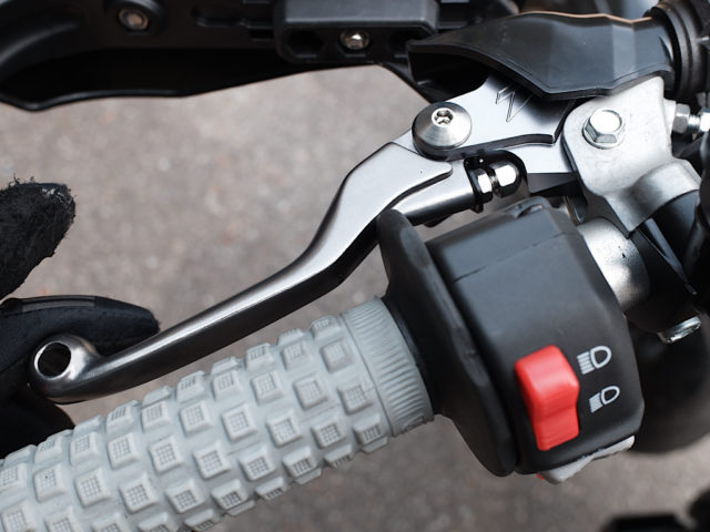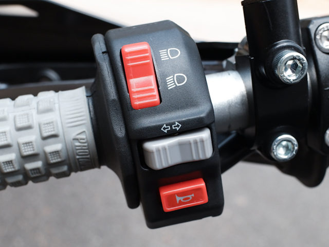 デイトナの小型スイッチも取り付け。ウインカーはプッシュキャンセルではなく、消すときは元に戻す操作。プッシュキャンセルが普及する前は普通のやり方だったので、操作自体は特に違和感はないが、スイッチの節度はぐにゃりとした感じ。同時にWRにも装着して操作性を合わせている。