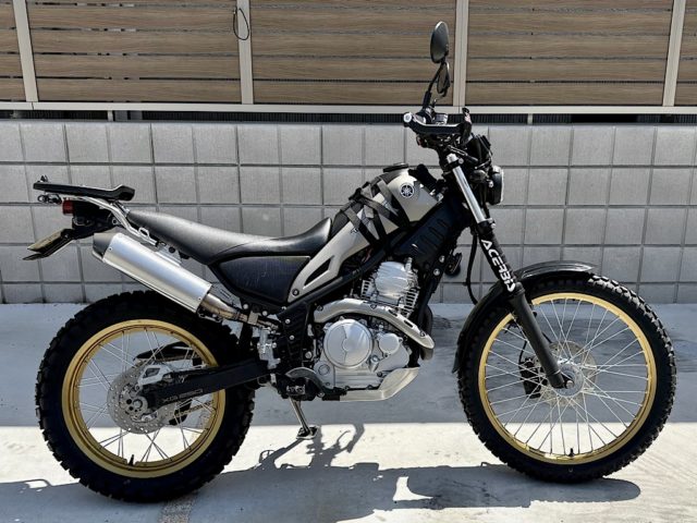 「当面ノーマルサイズで」と思っていたが、結局フルサイズ化した。ヤフオクなどで予備ホイールを物色していたが、トリッカー、セローともなかなかよいのが見つからない。トリッカーは数が少ないし、セローは程度がよいとなかなかの値段。中古に新品の半値以上出すのは馬鹿らしい気がして、セローのホイールセットを購入した。