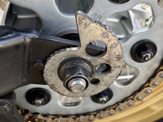 チェーンはノーマルの120Lから124Lに変更。計算上はノーマルより後輪が後ろにくるはずだが、スネルカムは2.1ノッチとあまり引かれていない。あまり余裕はないが、チェーンを変えずにノーマルホイールを装着できることを期待して124Lにしている。