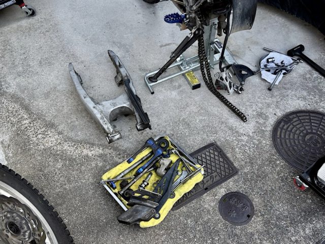 スイングアーム周りのベアリングも点検、こちらも久しぶり。グリス切れなどはなく、特に問題ないようだ。