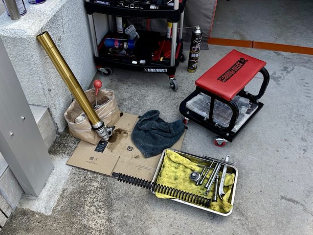 前回交換から約2万km走行したのでフロントフォークオイルを交換した。オイルは純正のS1にしている。左側は透明でほとんど汚れていなかったが、右側は黒く汚れており乳化もしているようだ。前回も同じような状況だったが、フォークシールからの漏れはないようだ。フォークキャップのO-リングを注文・交換して様子を見ることにしよう。