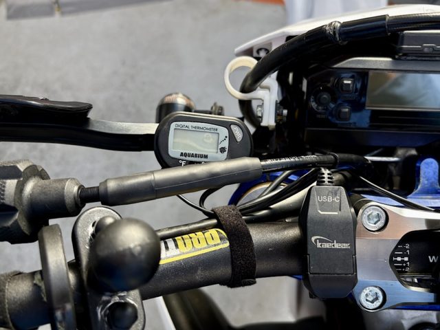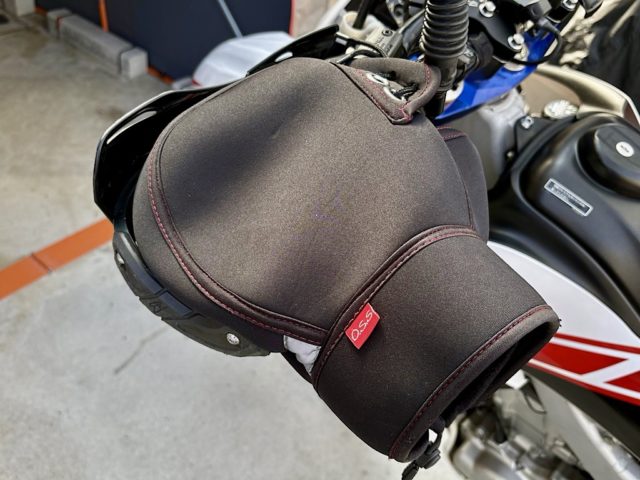 最後にコミネのシートヒーターを取り付け。スリムなオフ車にはヒートパッドが大きすぎるかと心配したが、この位置だとヒーター自体はシートの上に載っている。