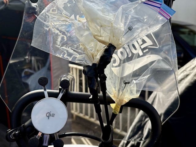 マフラー側にはDFGと同じような大きさの15Lの中華防水バッグにしてみた。中にはテント、チェア、テーブル、ピローが入っている。マフラーの熱を心配したが特に問題なさそうだった。