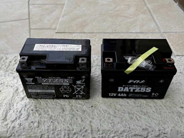 左が取り外したバッテリー。タイ・ユアサ製で容量は3.7Ah。右がデイトナ製で外寸は同じだが4Ahになっている。中華製とのことなので容量も盛っているのかな。